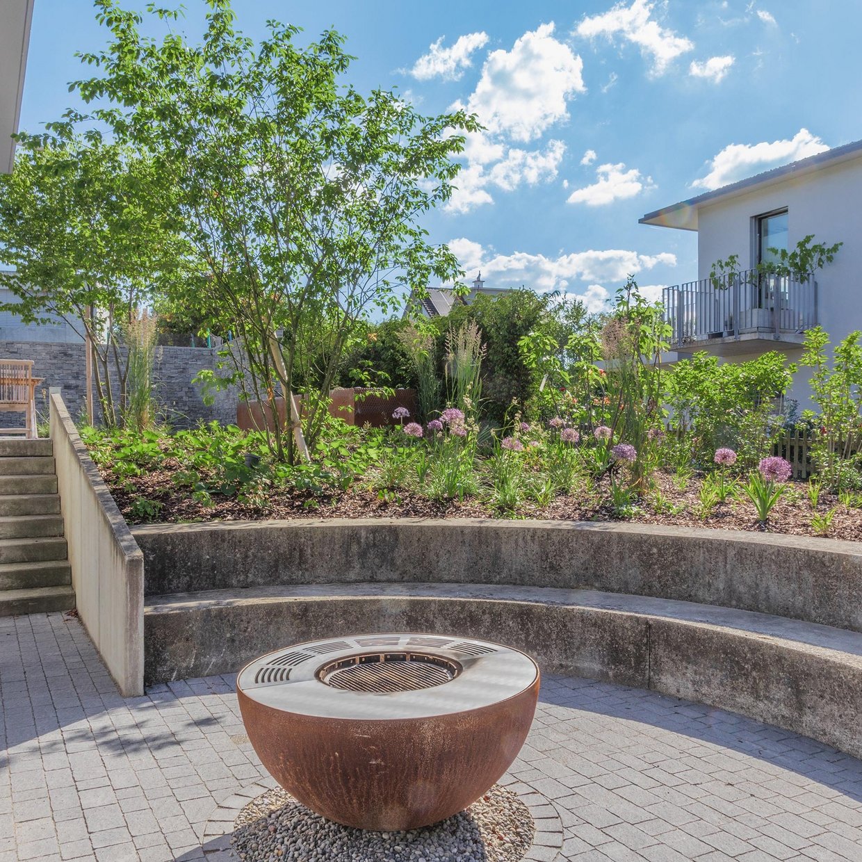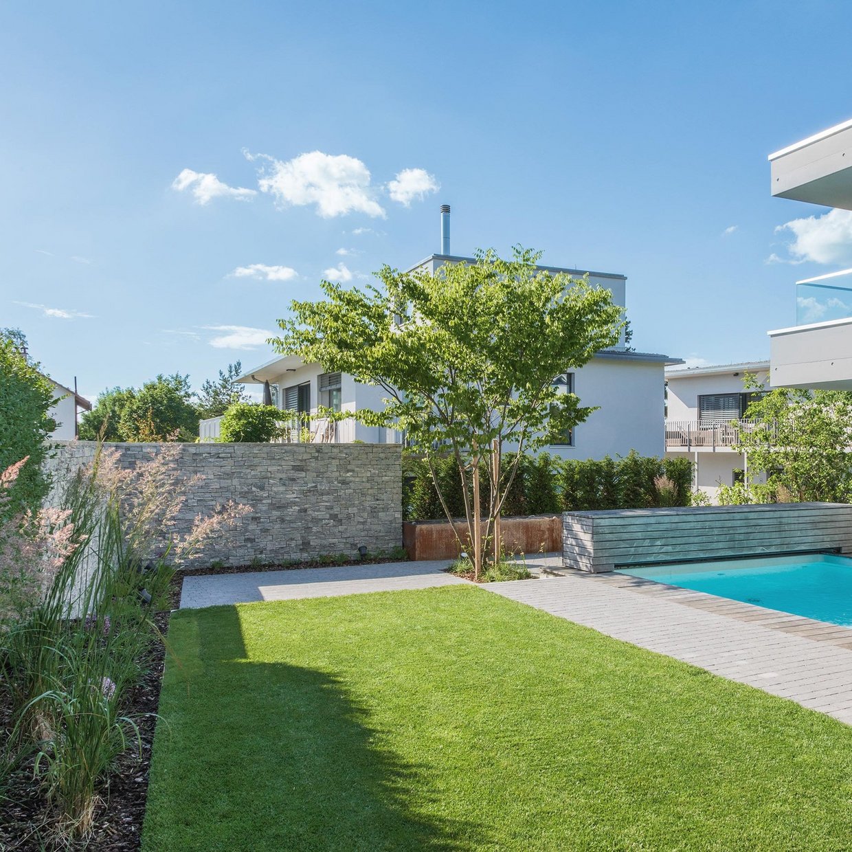 Um die geradlinigen Strukturen des Gartens hier und da aufzubrechen, entschied man sich für eine verspielte Bepflanzung und einen eher wilden Belag. Grosse Solitärgehölze dienen als Blickfang und geben dem Garten mehr Volumen. Der neue Garten gefällt nicht nur den Bauherren, sondern auch den Nachbarn bestens.