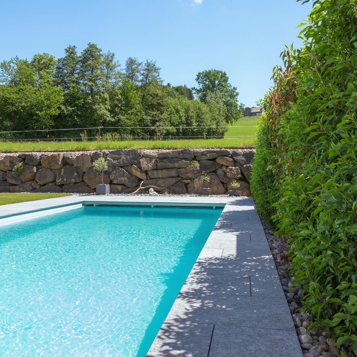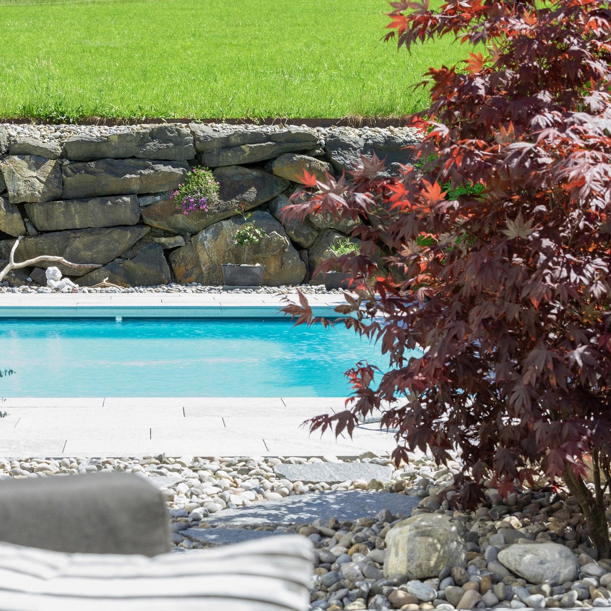 Der von Gartus gestaltete Garten gefiel der Familie auch nach Jahren noch ausgezeichnet, nur eins fehlte: ein Pool. Zur Inspiration habe man das Internet genutzt, doch für die Umsetzung «natürlich wieder den Gärtner des Vertrauens» beigezogen. Die zentrale Frage war: Wie lässt sich ein Pool in den bestehenden Garten integrieren, wo eine direkte Zufahrt fehlt?